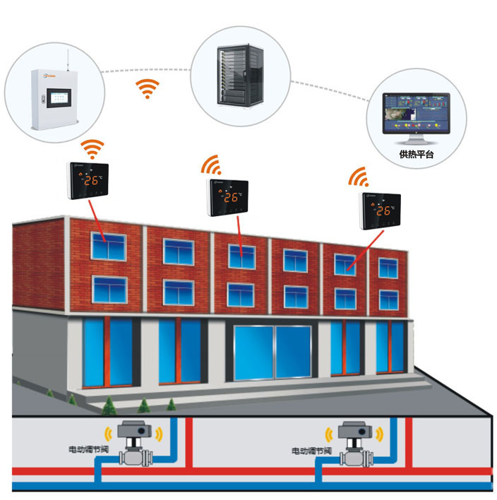 本系统通过室温传感器监测公建实时室内温度,将数据通过物联网通讯技术,传回供热监控平台,平台根据室内外温度,结合分时分区控制策略,通过电动调节阀调节整栋公建的供热量,降低供热成本,实现节能减排。