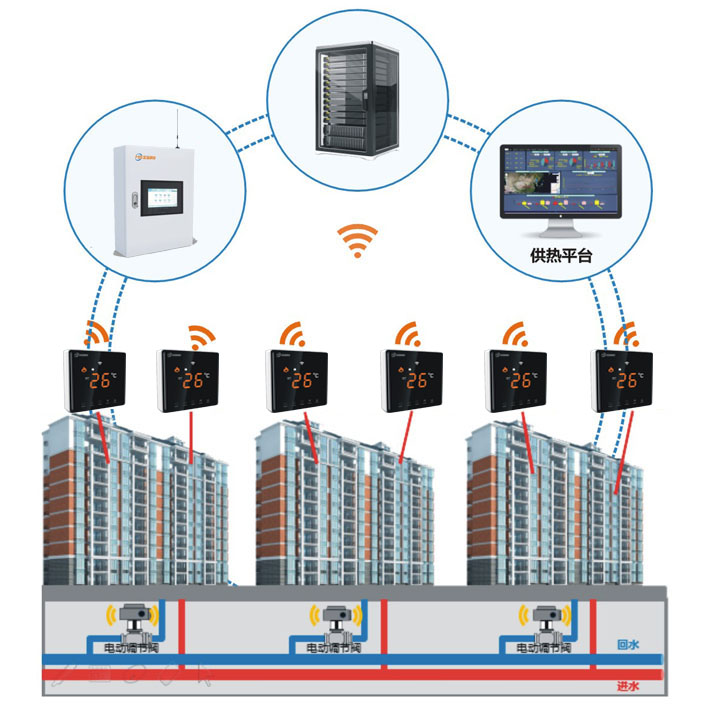 既有建筑室温采集与智能控制系统:既有建筑也称作“老旧建筑”,老旧小区(建筑)通过布点采温的方式,采集用户总量10%~15%的室内温度,将用户的室温传输到供热管理平台,运用“大数据下的室温均衡”控制方法,对楼栋或单元的阀门进行调节,保证室温均衡。