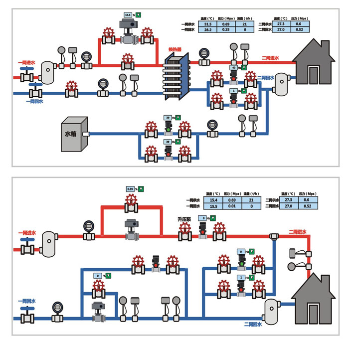 换热站智能调控系统是充分根据气象、换热站运行效果实时修正运行参数,全面掌握各个换热站和供热区域的状态。通过大数据分析,建立标准化的节能生产运营模型,实现各个换热站之间的联动联控和自适应智能运行,充分挖掘供热企业的节能潜力,降低能耗。